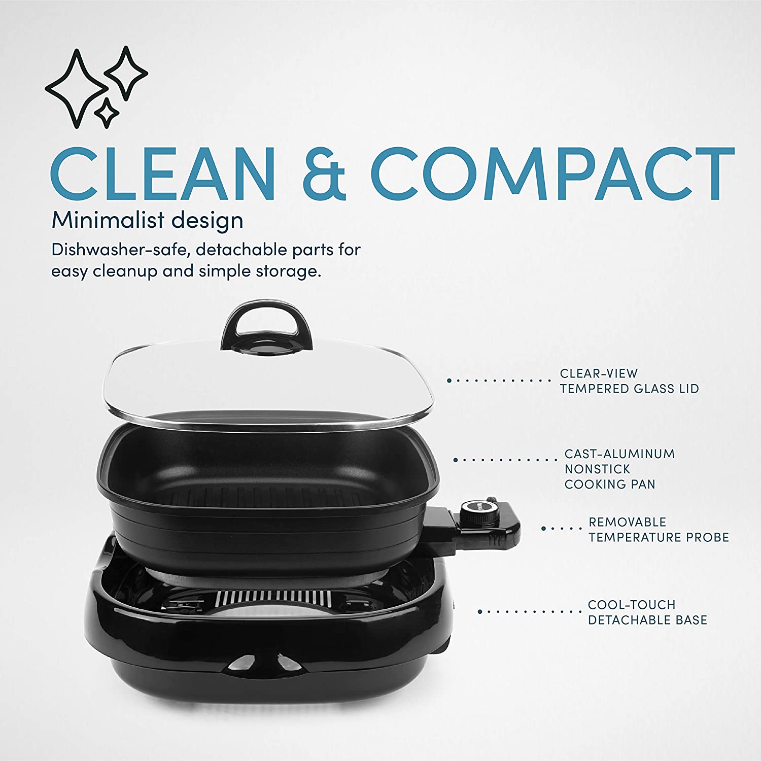 The AROMA Grillet 4Qt. 3-in-1 Indoor Grill is the hero of home cooking. Grill sizzling steaks, stew one-pot wonders, or sear any vegetable to perfection all with one compact countertop appliance. Bring outdoor flavors inside with its ridged grill surface that achieves great grilled flavor and beautiful grill marks with ease. The deep cooking pot with tempered glass lid allows for simmering delicious pot roasts, chili, fondues, soups and more. With just a turn of the knob, feast on with the versatile and durable Grillet!